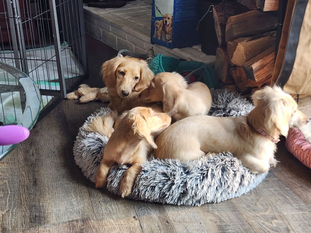Our dogs and puppies are raised in our home. They are not in kennels and they are almost always found on our laps! They are a part of our family.❤️ We are not a store that you can just drop in to shop, so please be respectful of our family time.