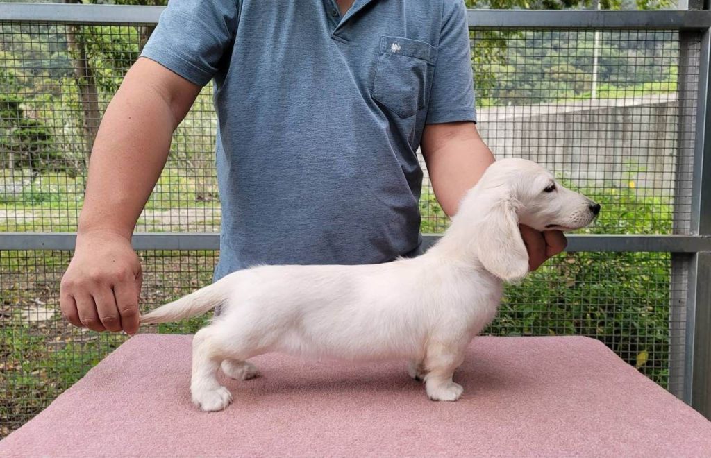 We specialize in ee cream long haired Dachshunds from our imported lines. They are clear creams with no black in their coats. However, we also breed chocolate and tan, chocolate and cream, ee reds ( a cinnamon color),black and cream and chocolate and cream dapples and occassional shaded creams.